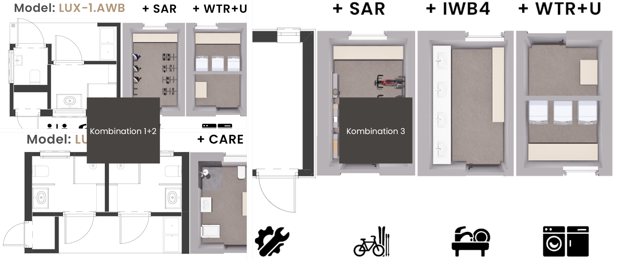 ZUSATZMODULE ergänzen die Grundmodule der Linien STANDARD und LUX und bieten zusätzliche Funktionen für besondere Anforderungen und Nutzergruppen. Ob für Familien, mobilitätseingeschränkte Gäste, Wintersportler oder autarke Reisende – die Zusatzmodule schaffen Mehrwert und Komfort dort, wo er gebraucht wird.