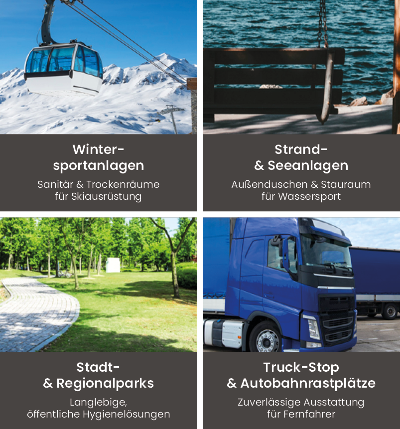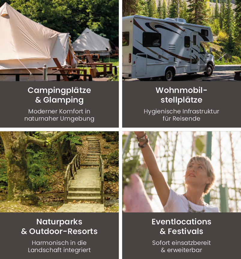 Sie bieten eine hochwertige, nachhaltige und vollständig ausgestattete Infrastruktur für Campingplätze & Glamping-Anlagen, Wohnmobilstellplätze, Naturparks & Outdoor-Resorts, Öffentliche & touristische Einrichtungen, Parkplätze für LKWs & Fernfahrer und dauerhafte Eventlocations & Messegelände.