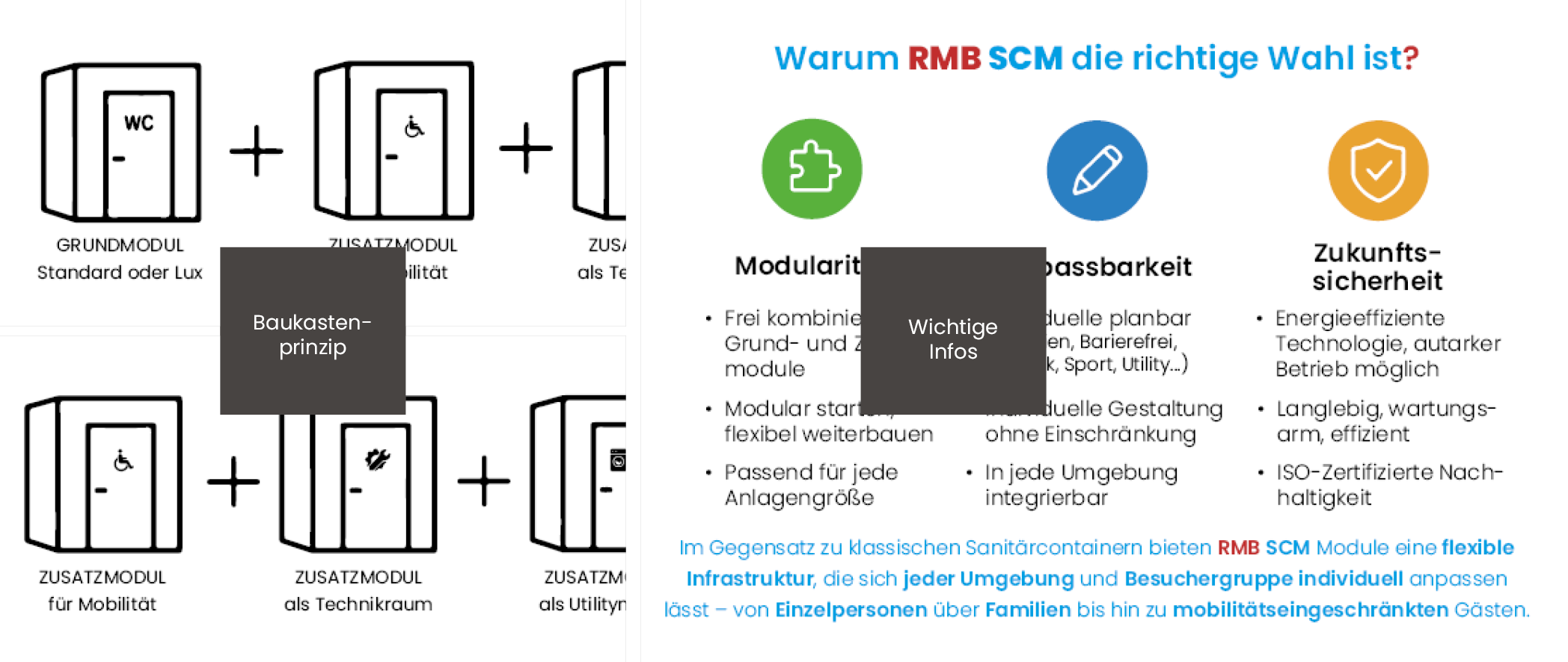 Im Gegensatz zu klassischen Sanitärcontainern bieten RMB SCM Module eine flexible Infrastruktur, die sich jeder Umgebung und Besuchergruppe individuell anpassen lässt – von Einzelpersonen über Familien bis hin zu mobilitätseingeschränkten Gästen.
